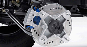 Dual ø180 mm disc brakes gripped by single-piston calipers provide strong stopping power with good feel. A third disc brake at the rear, measuring ø180 mm and gripped by a single-piston caliper complements the dual discs at the front.