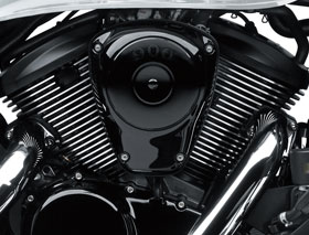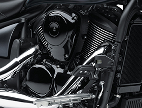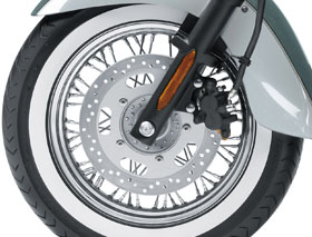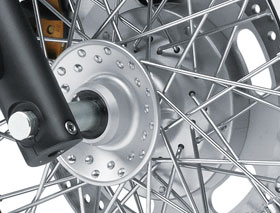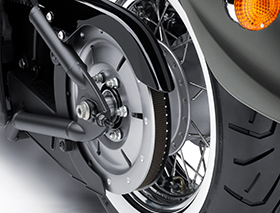 Chromed steel rims and spokes with “Spool-style” polished aluminum front hub. The 180mm rear tyre provides added traction while projecting a powerful image. Wider tyre than that found on most large-displacement cruisers.