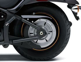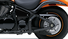 The Vulcan 900 Custom runs a belt drive. This provides lower unsprung weight than shaft drive to improve ride quality and suspension action. The Kawasaki belt drive system is low maintenance and low noise.