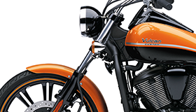 Very rigid, large-diameter box section backbone allows space for a larger fuel tank, and lightweight handling at low speeds. The fork offset and frame geometry combine for light, low-effort handling at ultra-low speeds. The Vulcan’s long wheelbase provides a stable, comfortable open road riding experience.