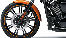 The Vulcan 900 Custom has handcrafted spoke style cast wheels shaped to form an elegant 3D double flanged design, appointing the Vulcan 900 Custom as a true custom machine. The wheel’s 18 “spokes” are arranged in pairs.