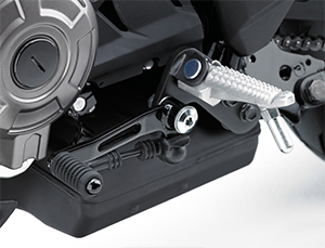 Offset laydown rear suspension enables a compact package while contributing to sporty handling. The linkage ratios and shock’s mounting angle were optimised for this model to ensure superb shock action and excellent ride comfort. Rear shock is 4-way preload adjustable, allowing riders to set the preload for their weight, and to adjust for tandem riding.