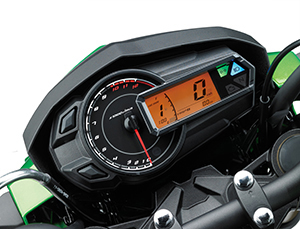 Instrument console combines a race analogue-style tachometer with a multi-function LCD screen. In addition to premium features like a gear position indicator and fuel gauge, the instruments many functions include speedometer, clock, odometer and dual trip meters.