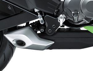 Two-piece exhaust system consists of a ø35 mm stainless steel header pipe and sporty silencer. The silencer’s six-sided cross section adds to the sporty looks while contributing to a good bank angle.