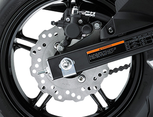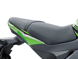 At the rear, a ø184 mm petal disc brake is gripped by a single piston caliper. Petal discs, just like Kawasaki’s large-displacement bikes, contribute to the sporty, supernaked looks.
