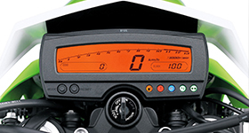 Aggressive headlight and front fender design. Two-piece radiator shrouds styled like the KX motocross line. Rear fender is a two-piece unit featuring a sharp tail light design that offers great visibility and further contributes to the KLX250S’ aggressive styling