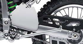 The KLX250S’s box and tubular section high tensile steel perimeter frame creates a slim, lightweight package. The 26.5° caster angle and short wheelbase contribute to quick handling, while the high rigidity of the frame ensures straight line stability.