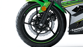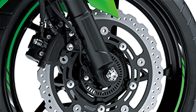 Large 310 mm semi-floating petal front disc (effective diameter: ø286 mm) is gripped by a balanced actuation dual-piston caliper. The disc – the largest in its class – is the same size as the ones used on the Ninja ZX-14R.