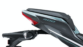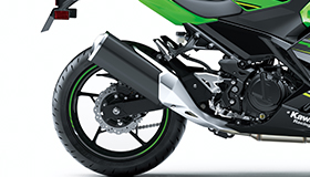 Radial tyres on the Ninja 400 offer light weight, excellent grip and contribute to both agile handling and riding comfort. Further, the 150 mm rear tyre adds to a more imposing looking rear end.