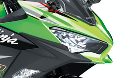 In addition to contributing to the Ninja 400’s sharper looks, slim dual LED headlamps (each featuring low and high beams, as well as a LED position lamp) are highly visible and offer significantly increased brightness. Chin spoilers at the bottom of the front cowl were inspired by the Ninja H2 and Ninja ZX-10R.