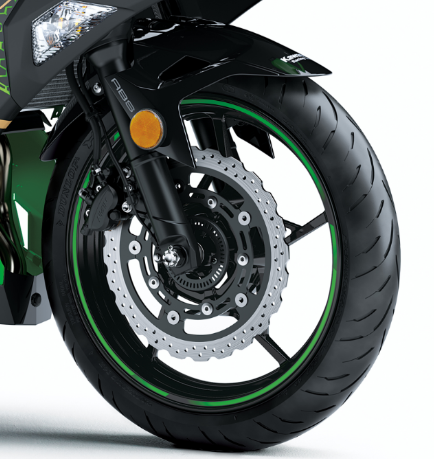 Stylish star-pattern 5-spoke wheels similar to those of the Ninja 650 contribute to light weight, while their optimised lateral rigidity benefits handling, adding to cornering stability. The wheels are a product of technology gained in MotoGP. They also contribute to the bike’s light looks.