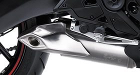 Sportier muffler end cap contributes to the sharper image. The under-engine exhaust muffler aids mass centralisation and the styled muffler end cap gives a much sharper image.