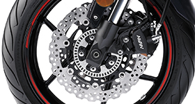 Dual ø300 mm petal discs are gripped by new twin-piston calipers. The design of the new calipers contributes to the bike’s sportier image, while new brake pad material offers a stronger initial bite when the brakes are first applied.