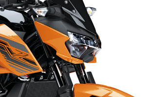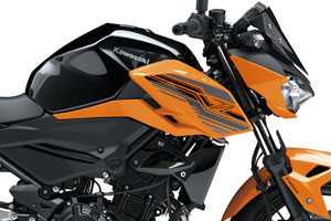 The new Z400 combines the sharp, aggressive style of the Z650 with the large-volume design of the Z300 to create an aggressive, agile, masculine impression. Its muscular, athletic bodywork reflects the increased performance while forming a flowing design that appears to float above the engine. Like other models in the Z Series, sugomi design elements (crouching stance, low-positioned head and upswept tail) give it a silhouette instantly recognisable as a Kawasaki Supernaked.