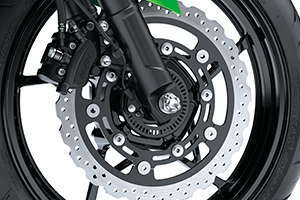 Large 310 mm semi-floating petal front disc is gripped by a balanced actuation dual-piston caliper. The disc is the same size as those used on the Z1000. At the rear a 220 mm petal disc is slowed by a dual-piston caliper with larger (25.4 mm >> 27 mm) pistons.