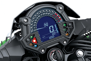 The Z400 is equipped with the same stacked instrument cluster as the Z650. Offering an easy-to-read layout, the analogue-style tachometer features a gear position indicator at its centre and sits atop a multi-function LCD screen. In addition to the digital speedometer and gear position indicator, display functions include: odometer, dual trip meters, fuel gauge, remaining range, current and average fuel consumption, coolant temperature, clock and the Economical Riding Indicator.