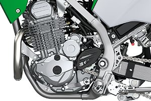 Providing a light, manoeuvrable package was a key consideration. Designing the simple air-cooled engine concurrently with the easy handling perimeter frame helped keep the KLX230 compact, while the balance between the engine and frame results in performance that can be enjoyed by a wide range of riders.
